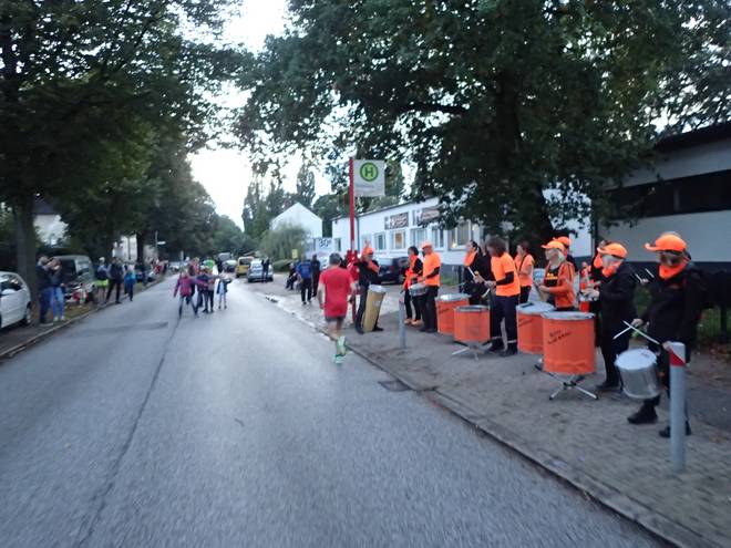 Walddörfer Straße 19.24 Uhr / Km 18,1 Eine von vielen Musikbands an der Strecke. Und immer wieder die Kinder, die einem die Hände hin hielten zum Abklatschen. Zwischen Kilometer 15 und 18 hatte ich eine Weile damit aufgehört, fing nun aber wieder damit an. Es gehört doch einfach dazu. |