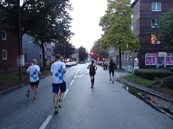 Steilshooper Allee 18.32 Uhr / Km 6,6 Für 1:39 Stunden war es aber wiederum zu langsam. Was tun? Im März war ich beim BSV-Halbmarathon 1:41:24 Stunden gelaufen. Sollte ich die Zeit angreifen? Aber der Marathon am Vortag war mit 700 Höhen-Metern und 4:20:11 Stunden schon so flott gewesen. Würden die Beine das hier überleben? |