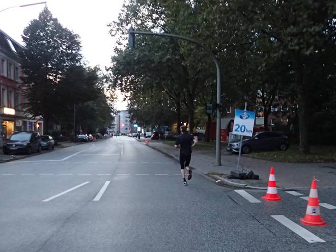 Walddörfer Straße 19.33 Uhr / Km 20,0 Langsamer vielleicht, aber die Ausdauer war grandios. 1:32:45 Stunden bei Kilometer 20. Die vierten fünf Kilometer war ich in nur 22:30 Minuten gelaufen. Jeder Abschnitt von fünf Kilometer schneller als der zuvor. Nette Renneinteilung. |