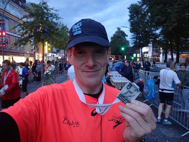 Wandsbeker Marktstraße 19.39 Uhr / Km 21,0975 1:37:25 Stunden. Klasse Zeit plus eine schöne Medaille. Mit 4:37 Min/Km war ich im Schnitt über den Kurs gejagt. Nach Kilometer 20 waren es sogar 4:14 Min/Km. Da war genug Ausdauer übrig. |
