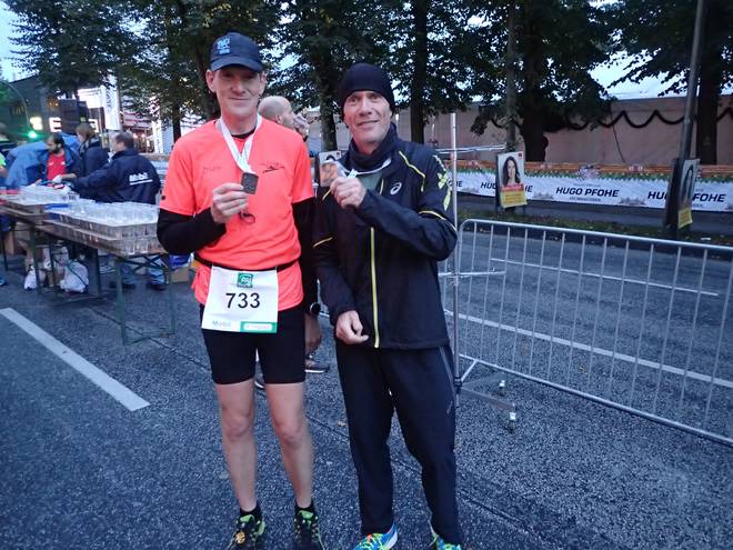 Wandsbeker Marktstraße 19.41 Uhr / Km 21,0975 Im Ziel traf ich auf Lutz, der die Strecke in nur 1:24:14 Stunden gefinisht hatte (3:59,6 Min/Km). Im ersten Wettkampf nach längerer Verletzungspause. |