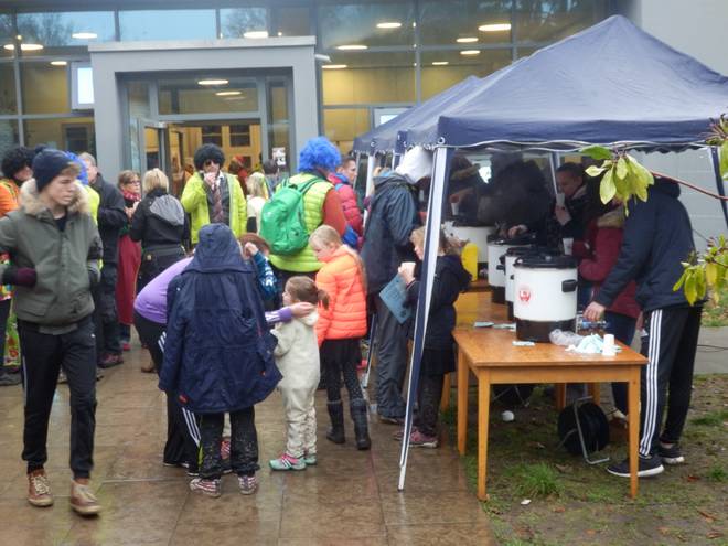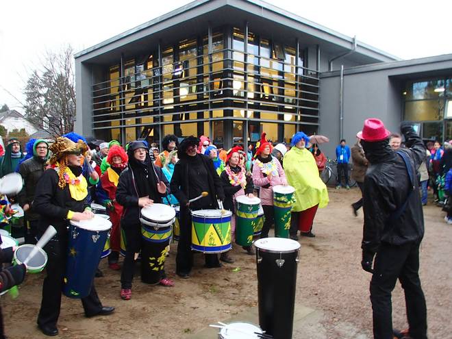 Schule "An den Teichwiesen" 11.43 Uhr Die Sambaschule Volksdorf war trotz Regen wieder mit dabei und sorgte für gute Stimmung, auch wenn die Mehrzahl der Läufer doch lieber in der Schule auf den Start wartete. |