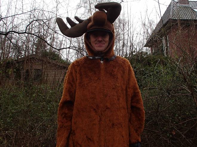 Volksdorfer Teichwiesen 11.58 Uhr Ich war wieder einmal als Elch dabei. Das Fell wurde zwar im Regen schnell schwer, aber ich wollte ja keinen Marathon laufen. |