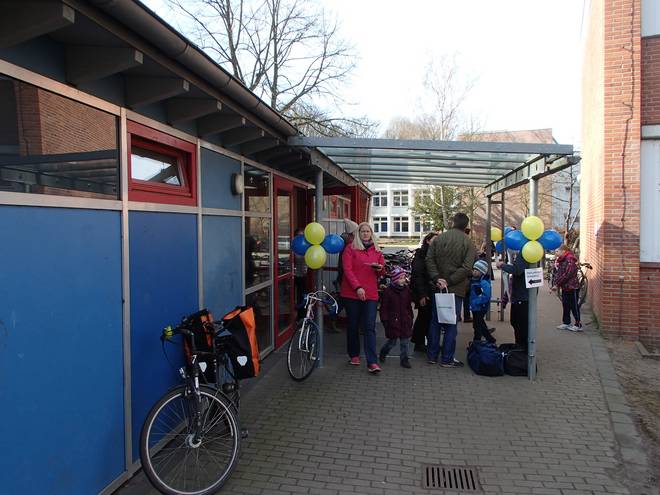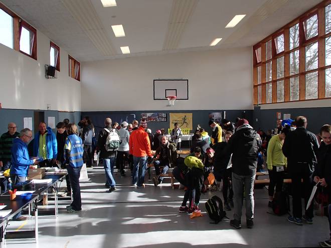 Schule am Eichtalpark 9.37 Uhr Hier in der Halle gab es die Startnummern. Die Umkleiden waren im hinteren Teil der Schule geöffnet. |