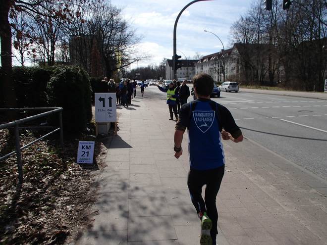 Wandsetal Runde 2 11.28 Uhr / Km 14,0 Ich war nun ganz alleine auf der Strecke. So weit ich sehen konnte, war niemand mehr vor mir. Also... da waren schon noch Läufer vor mir, aber weit weit vorne weg. |