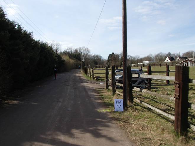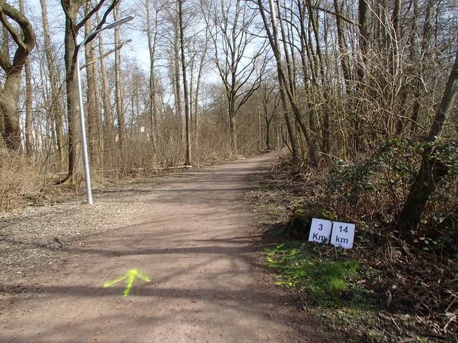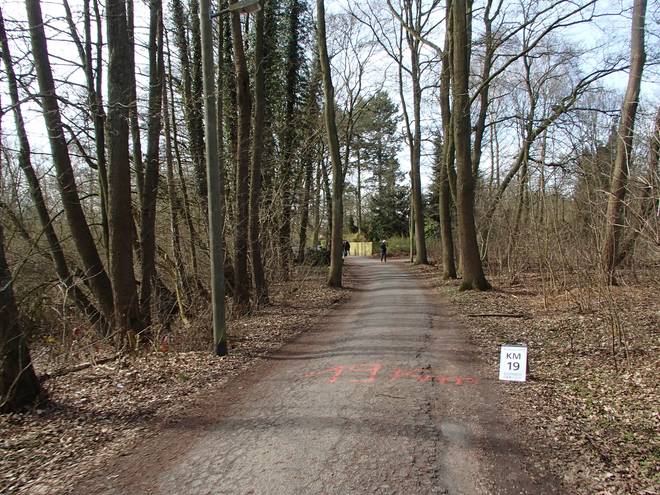 Anny-Tollens-Weg Runde 2 11.37 Uhr / Km 16,1 Auch hier gab es einen kleinen Extraweg zu laufen. Das irritierte mich, weil ich kurz dachte, ich wäre falsch. Aber vermutlich hatte ich nur einen Pfeil auf dem sehr gut markierten Kurs verpaßt. |