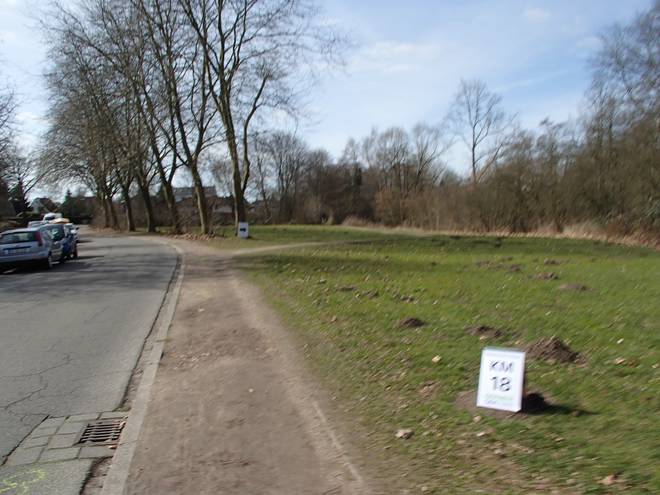 Rahlstedter Uferweg Runde 1 10.54 Uhr / Km 5,5 Der nord-östliche Punkt der Strecke war zum ersten Male erricht. Nun ging es wieder zurück. |