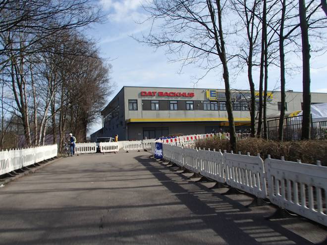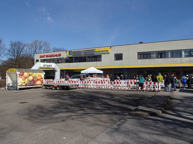 EDEKA Ölmühlenweg 9.53 Uhr Start und Ziel waren auf dem Parkplatz dieses Supermarktes aufgebaut. |