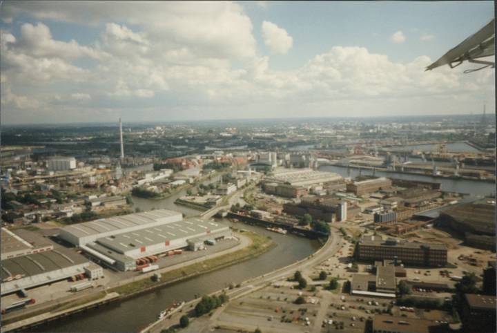 Außenslater Heinrich-Hertz-Turm Kehrwiederspitze Grasbrook Norderelbe vom Wasserflugzeug aus |